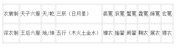天子六服和王后六服相加不仅象征天之大数十二,也分别代表乾坤天地、三辰五行之天道,以分别代表了汉服的两种基础服制——衣裳制和深衣制。
