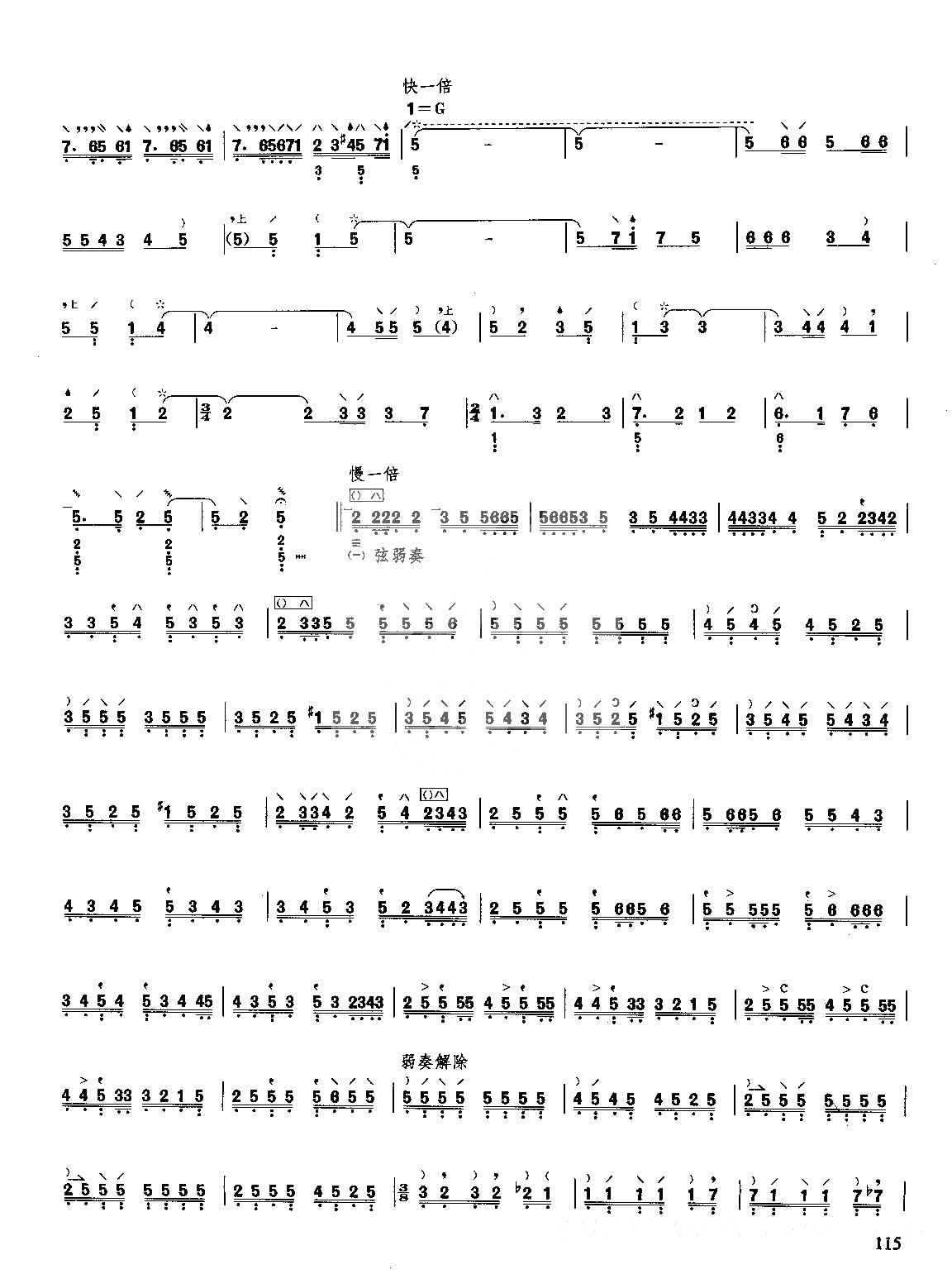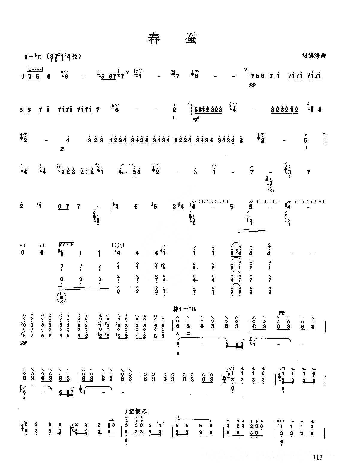 琵琶曲谱-《春蚕》 此曲为刘德海“人生篇”之一,取材于四首维吾尔族民问乐曲。通过“春蚕到死丝方尽”的精神内涵,寓意人生与事业奋斗的艰辛。